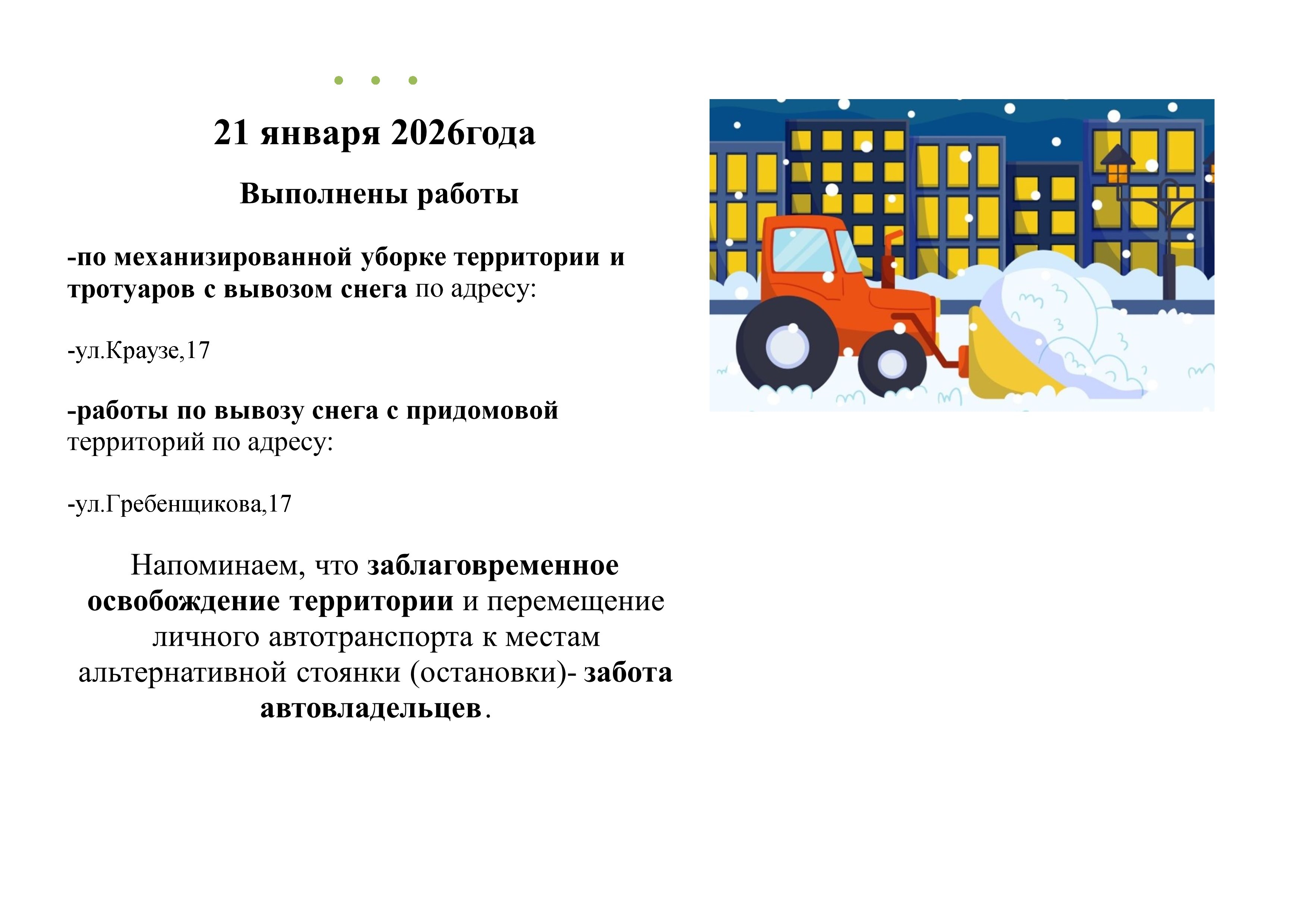 Обращаем внимание, что обеспечение оперативной работы снегоуборочной техники напрямую зависит от активности жителей.